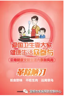倡导健康文明饮食,革除滥食野生动物、生肉、草乌等陋习,少食腌肉腌菜等腌制食品,普及识别有毒野生菌知识,树立广大人民群众健康饮食新风尚。
